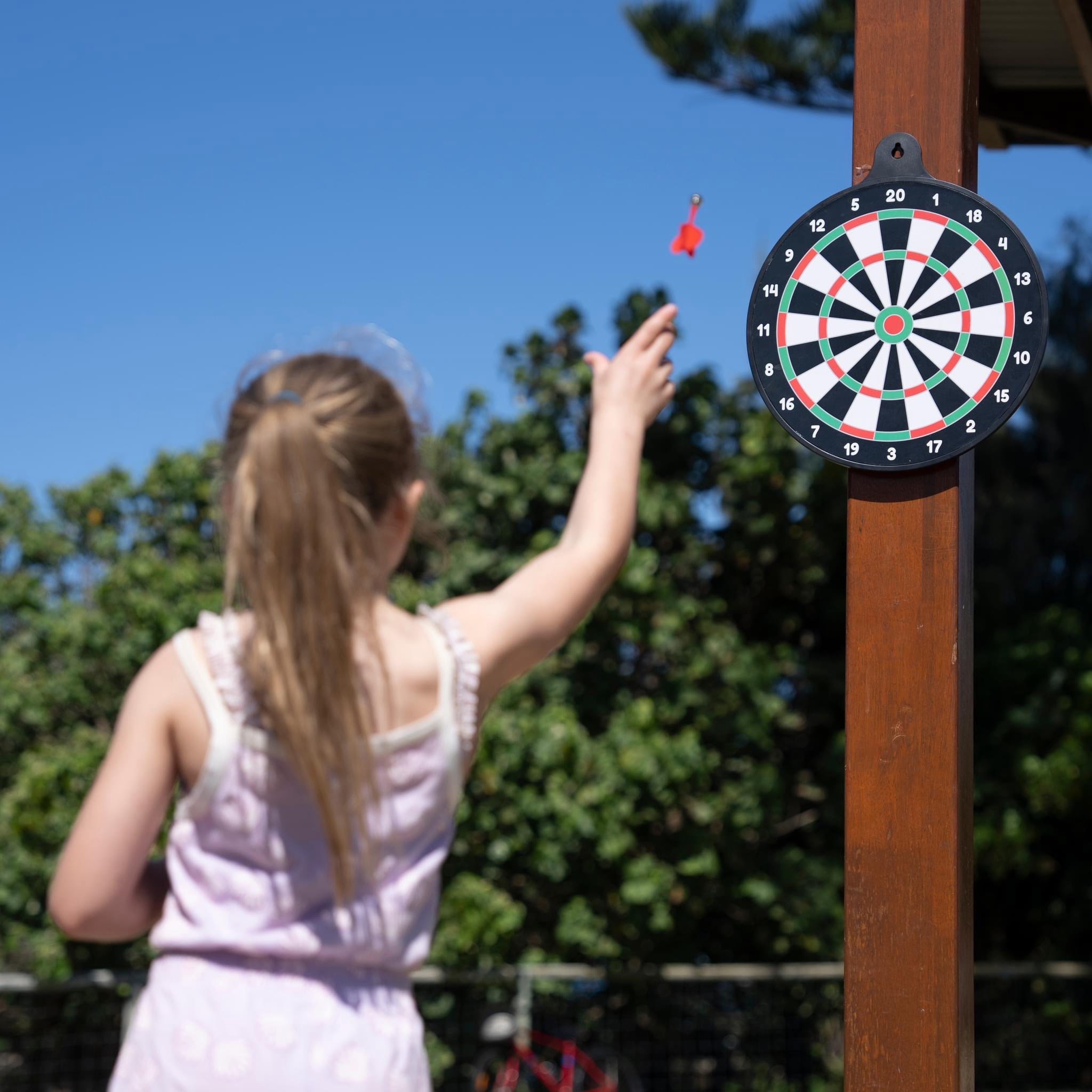 It’s a strong magnetic playing board that’s 15″ in diameter and has the traditional dartboard on one side and a target game on the other!